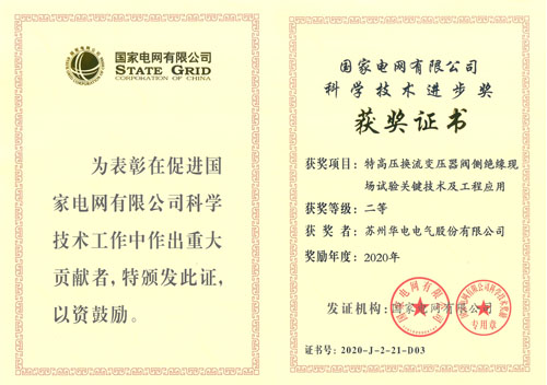 苏州华电参与的科技项目《特高压换流变压器阀侧绝缘现场试验关键技术及工程应用》荣获2020年度国家电网有限公司科学技术进步奖二等奖。