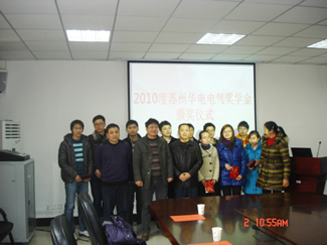 苏州华电在华中科技大学电气与电子工程学院设立的“苏州华电电气奖学金”2010年度颁奖活动于2011年3月份在华中科技大举行。苏州华电相关领导亲临科技大,为南敬、刘刚、冯西波等十三位表现突出的硕士和博士研究生颁奖。充分体现了苏州华电注重人才,以人为本的企业精神。